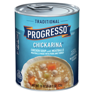 Progresso Traditional Chickarina Chicken with Meatballs Soup Save when you order Progresso Traditional Chickarina Chicken with Meatballs Soup and thousands of other foods from Giant online. ... Back. All Aisles / Soups & Canned Goods / Soup, Broth & Bouillon / Canned Soup / Canned Chicken Soup / Progresso Traditional Chickarina Chicken with ... Calories 1.5 g. Sat Fat 680 mg. Sodium 1 g. Sugars Nutrition ...