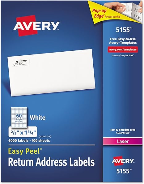 Avery Easy Peel Return Address Labels, Sure Feed Technology, Permanent ... Arrives by Mon, Aug 15 Buy Avery Easy Peel Return Address Labels, Sure Feed Technology, Permanent Adhesive, 2/3" x 1-3/4", 6,000 Labels (5155) at Walmart.com