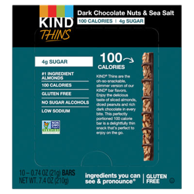 Thins Nut Bars | Gluten Free Snack Bars - KIND Snacks KIND ® Thins Thins are made with #1 ingredient almonds, 100 calories or less per bar, 4g of sugar and gluten free. The thin layer of sliced and diced nuts is paired with a sweet chocolatey or caramel coating layered on the bottom and finished with a drizzle on top for a rich and indulgent experience. protein fiber added sugar