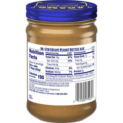 Natural Creamy Peanut Butter -Unsalted Available in: 16 OZ Jar ; Serving Size. 2 Tbsp (32g) ; Calories. 190 ; Trans Fat ; Ingredients. Peanuts.