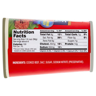 Grace Canned Corned Beef, 12 oz - Kroger Nutrition Facts servings per container Serving size 0.25cup (56 g) Amount per serving Calories 130 % Daily value* Total Fat 8g 12.31% Saturated Fat 4g 20% Trans Fat 0g Cholesterol 55mg 18.33% Sodium 490mg 20.42% Total Carbohydrate 1g 0.33% Dietary Fiber 0g 0% Sugar 1g Protein 14g Calcium 0mg 0% Iron 1.1mg 6.11%