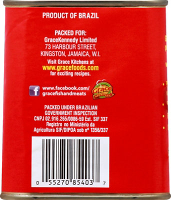 GraceKennedy Grace Corned Beef, 12 oz - Walmart.com About 6 Servings Per Container Serving Size 1/4 cup Amount per serving Calories 130 * The % Daily Value (DV) tells you how much a nutrient in a serving of food contributes to a daily diet. Calories per gram: Fat 9 • Carbohydrate 4 • Protein 4 Product details Corned Beef with Juices 12 oz (340 g) Product of Brazil. Chill can before opening.