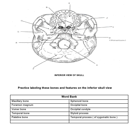Bones of the Skull- INFERIOR VIEW Diagram | Quizlet Bones of the Skull- INFERIOR VIEW + − Flashcards Learn Test Match Created by caseyjc2002 Terms in this set (16) what does point 1 show? The Zygomatic Bone what does point 2 show? The Sphenoid Bone what does point 3 show? The Vomer what does point 4 show? The Occipital Condyle what does point 5 show? The Foramen Magnum what does point 6 show?