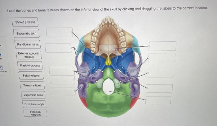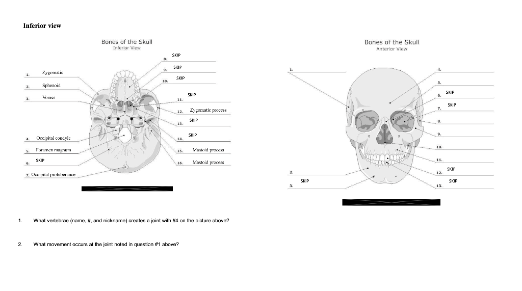 Solved Label the bones of the skull in inferior view. | Chegg.com Label the bones of the skull in inferior view. Greater wing of sphenoid Occipital bone Temporal bone Zygomatic arch Vomer Do Parietal bone Palatine bone < Prev 17 of 39 Next > Links search Bill Question: Label the bones of the skull in inferior view.