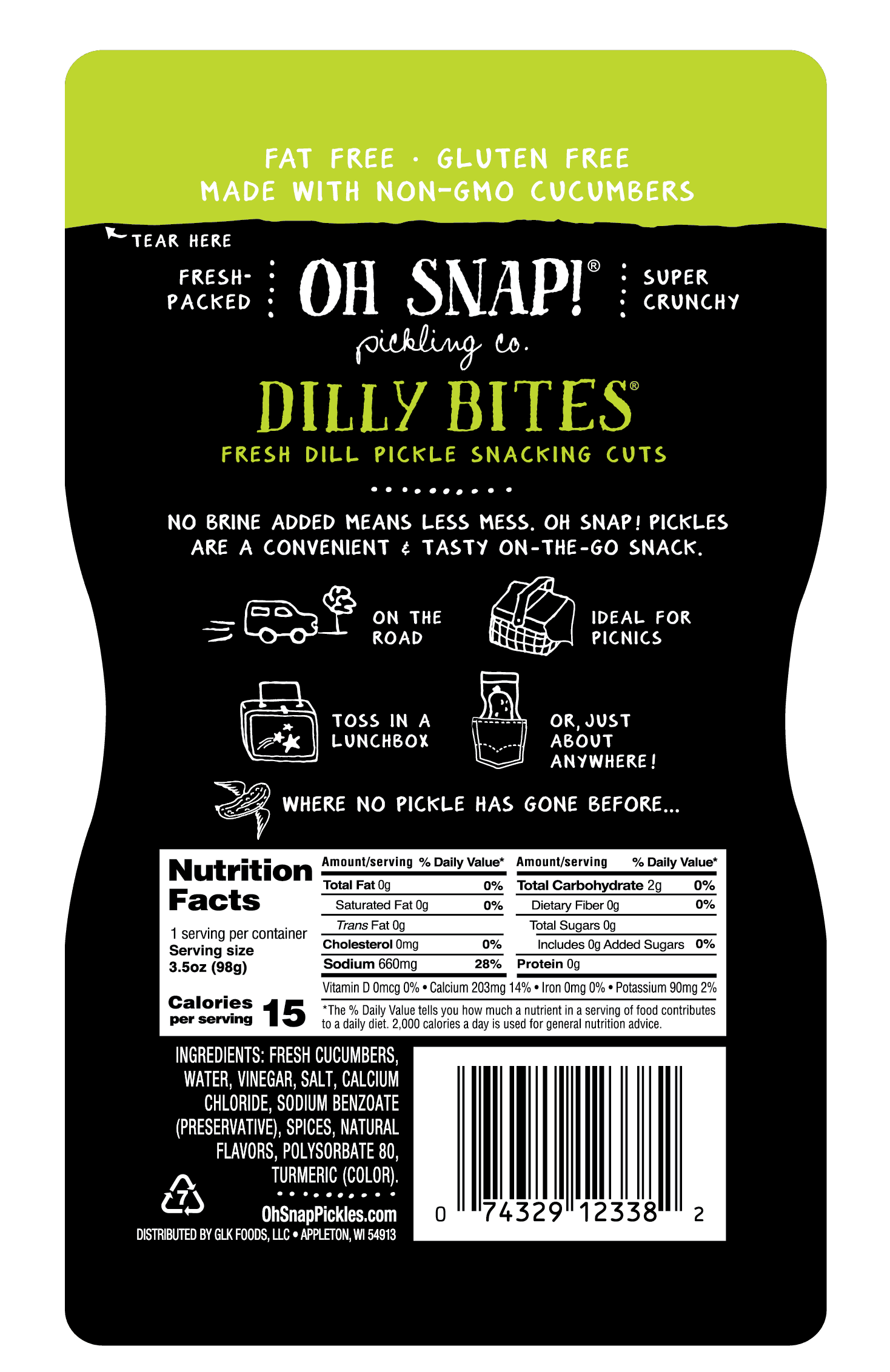 Oh Snap Gone Dilly Dill Pickle -- 12 per case. - amazon.com Oh Snap! Pickling Co., Dilly Bites Fresh Dill Pickle Snacking Cuts, 3.5 oz. (6 count) 4.3 out of 5 stars 220 3 offers from $24.99 Oh Snap! Fresh Pickle Bites Dill & Hottie Variety Pack, 3.5 oz, Pack of 12 4.2 out of 5 stars 342 4 offers from $25.99 OH Snap Cool Beans Pickled Green Beans, 1.75 Ounce -- 12 per case. 3.8 out of 5 stars 120