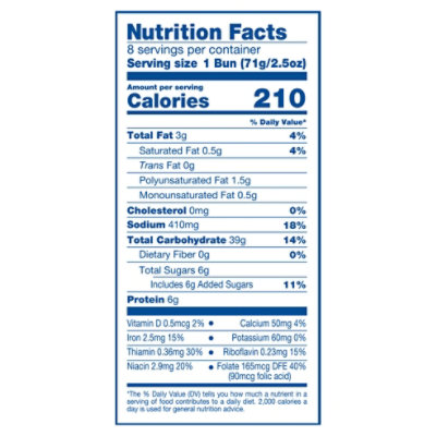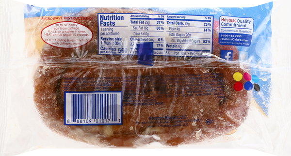 Hostess Jumbo Honey Bun Glazed - Stop & Shop Nutrition Facts ; Cholesterol: 0mg 0 ; Sodium: 360mg 15 ; Total Carbohydrate: 69g 23; Dietary Fiber: 2g 8; Sugars: 34g ; Sugars: 34g ; Protein: 8g.
