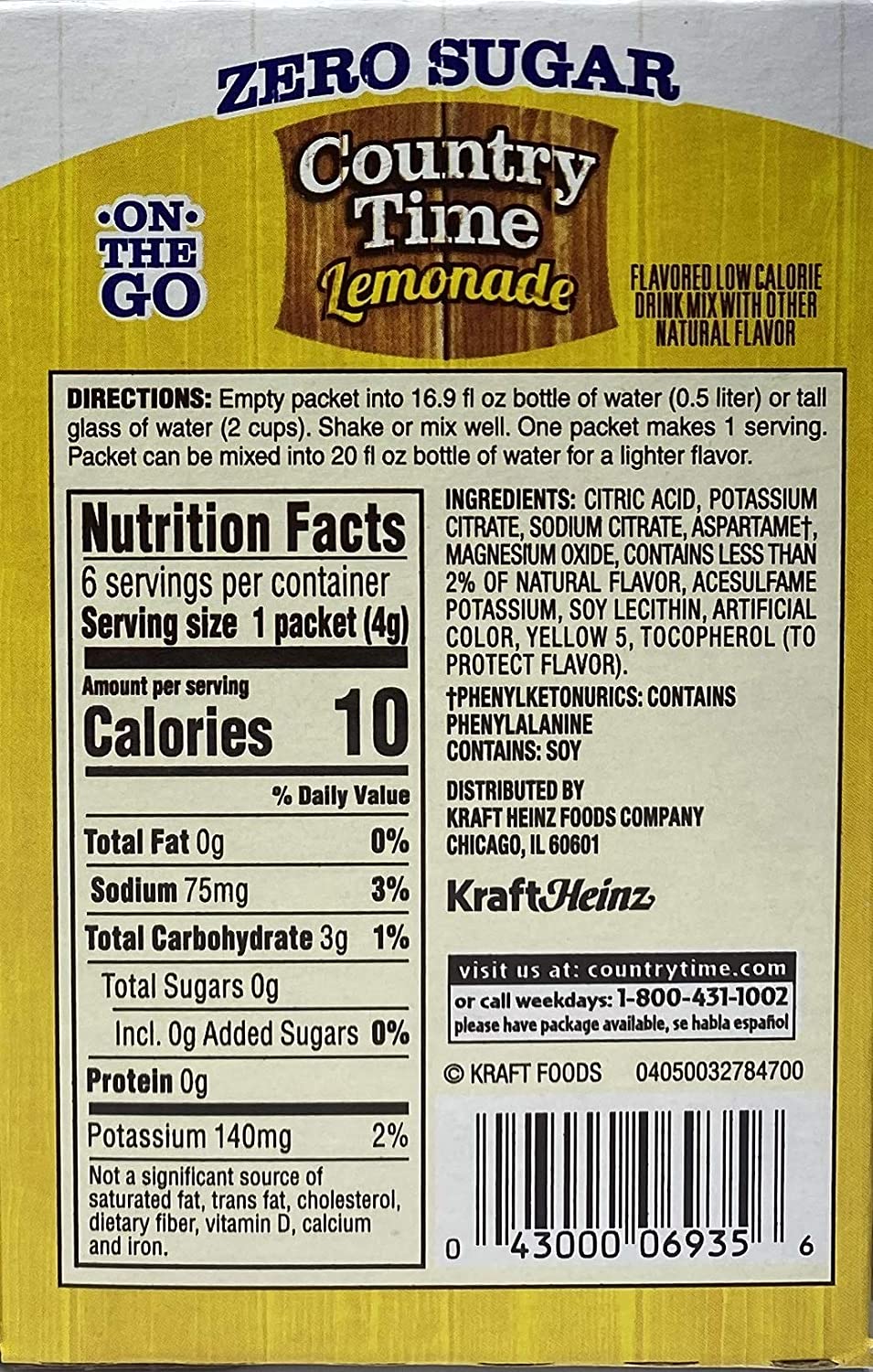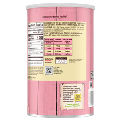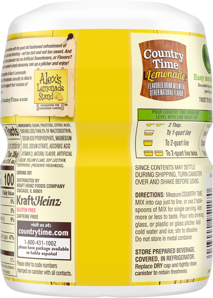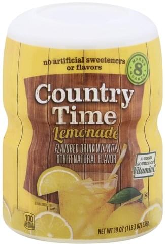 Country Time Lemonade Drink Mix - H-E-B Ingredients Sugar, Fructose, Citric Acid, Contains Less than 2% of Ascorbic Acid (Vitamin C), Natural Flavor, Soy Lecithin, Maltodextrin, Sodium Acid ... Country Time Drink Mix Lemonade - Giant Food Stores 100 Calories per serving. Gluten free. Caffeine free. Makes 8 quarts. My lemonade stand cash. Save 0 meter. Woohoo! You did it. Almost there. Half way ... Country Time Lemonade Nutrition Facts - Eat This Much For a Serving Size of 360 ml ; How many calories are in Country Time Lemonade? Amount of calories in Country Time Lemonade: Calories 150, Calories from Fat 0 (0 ...
