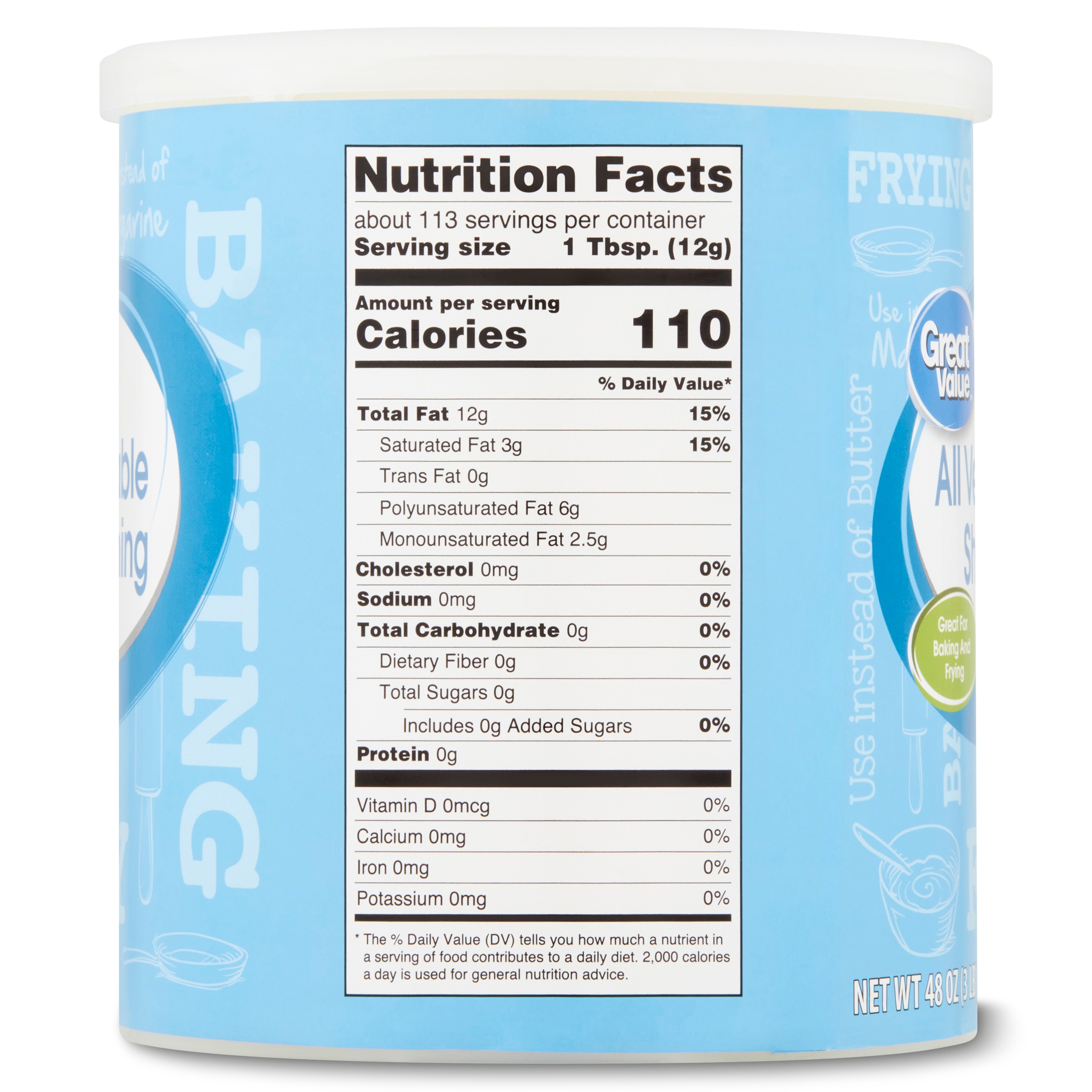 All-Vegetable Shortening Nutrition Facts ; Sodium 0mg ; Total Carbohydrate < 1g, 0% ; Total Carbohydrate < 1g ; Dietary Fiber 0g, 0% ; Dietary Fiber 0g ...