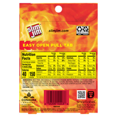 Slim Jim Nutrition Facts. Calories, carbs, fat, sodium & more ... Slim Jim Mild Snack Stick Short sticks. 4 packages (32g) Nutrition Facts. 150 calories. Log food. Slim Jim Original Snack Stick Giant. 1 package (27.5g) Nutrition Facts. 130 calories.